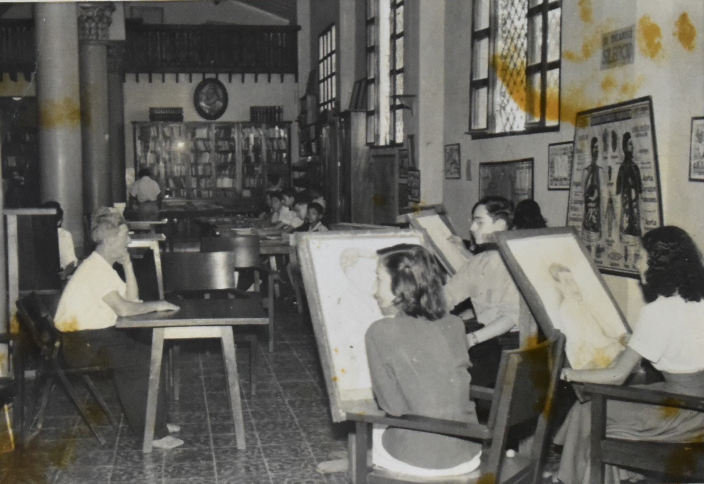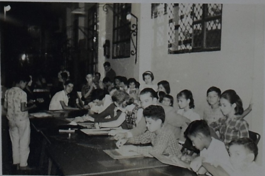 Fotos tomada en la década de los 60, en la cual se pueden ver los usuarios en clases de pintura en la biblioteca de Itagüí actualmente Auditorio Diego Echavarría Misas.